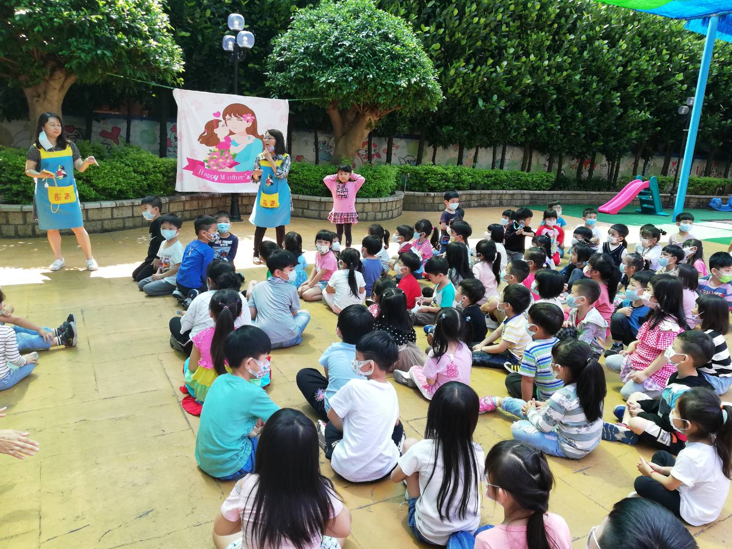 師生在長青幼兒園裡,開開心心