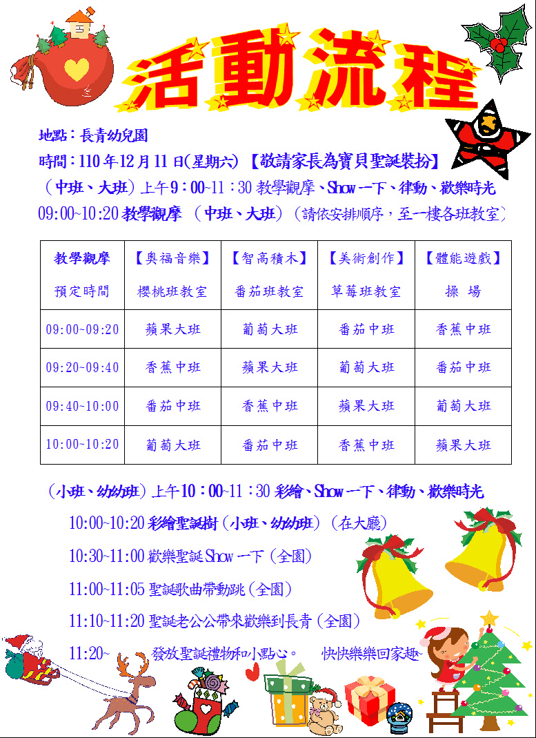 2021年12月11日(週六)上午 長青幼兒園舉辦聖誕節活動 歡迎 闔家參與~ 配合事項: *當日參加者,請佩戴口罩使可入園。 *入園時,請配合本園測量體溫和手部消毒。 活動流程表如下: