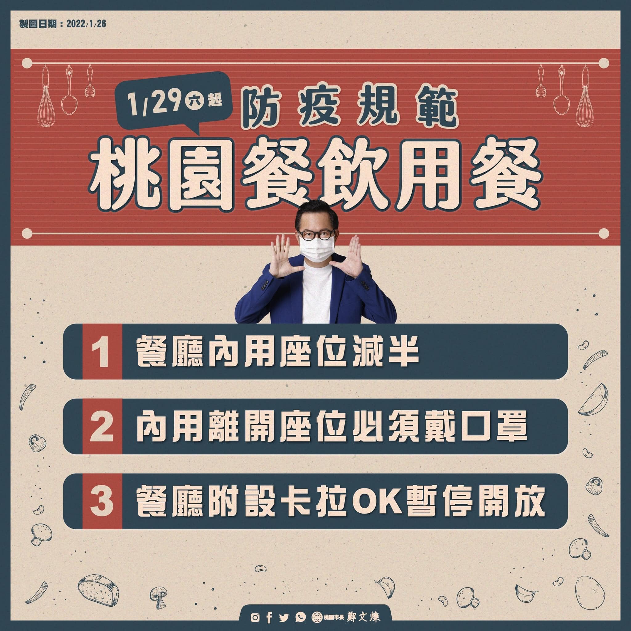 我們宣布1/29(六)起「桃園市餐廳內用座位減半、
