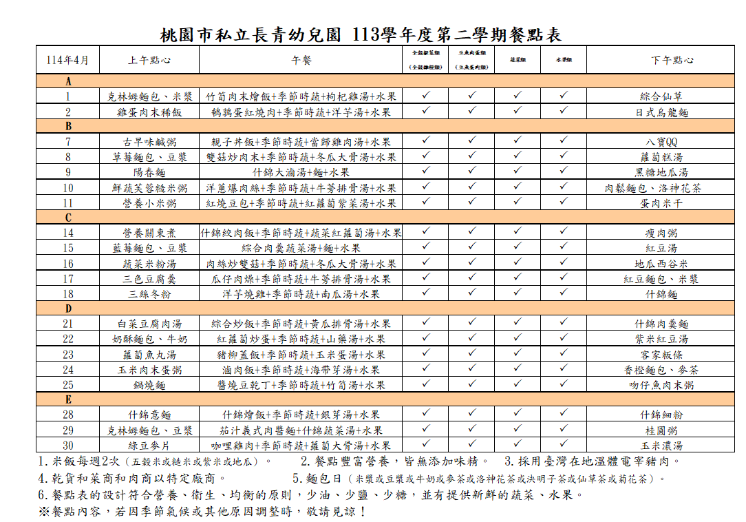 113學年度4月份菜單