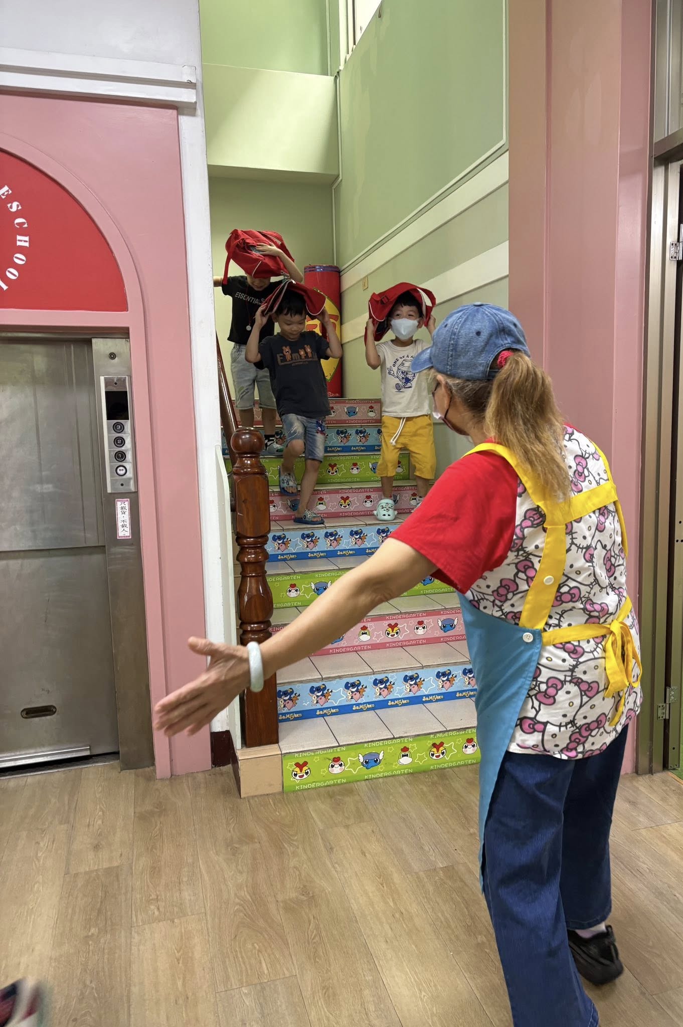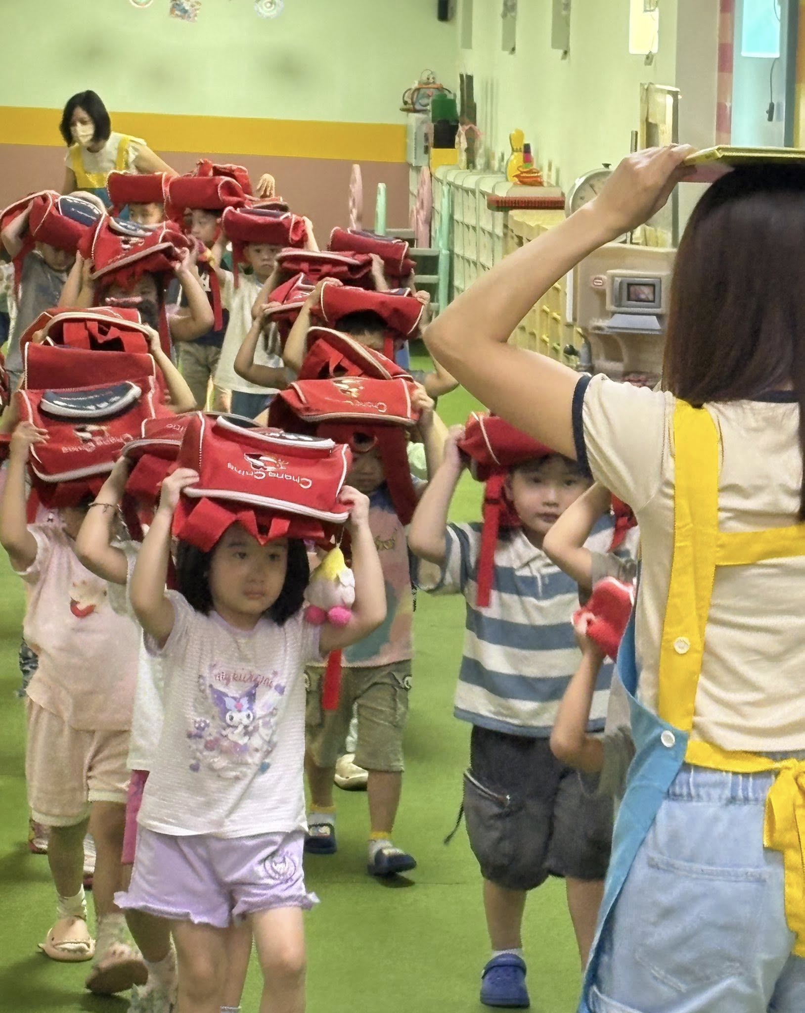 地震稍歇,老師帶領寶貝們(不慌。不跑。不語)避難疏散到安全的地點。