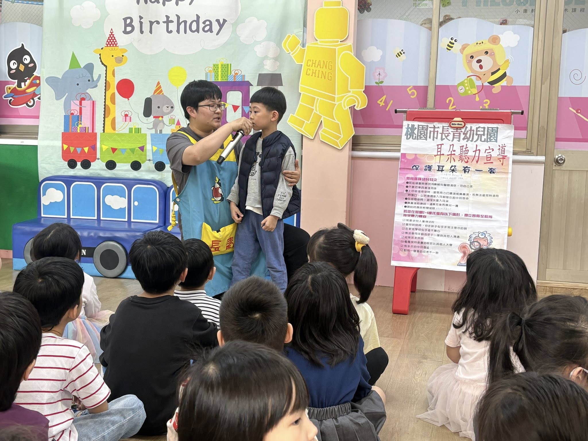 老師透過海報讓幼兒瞭解如何保護耳朵~~