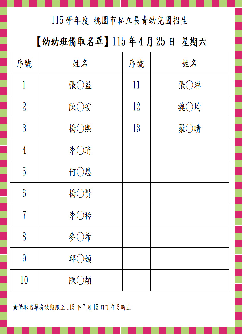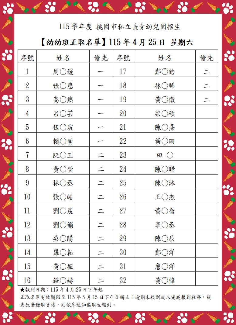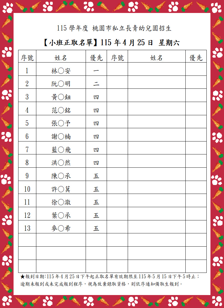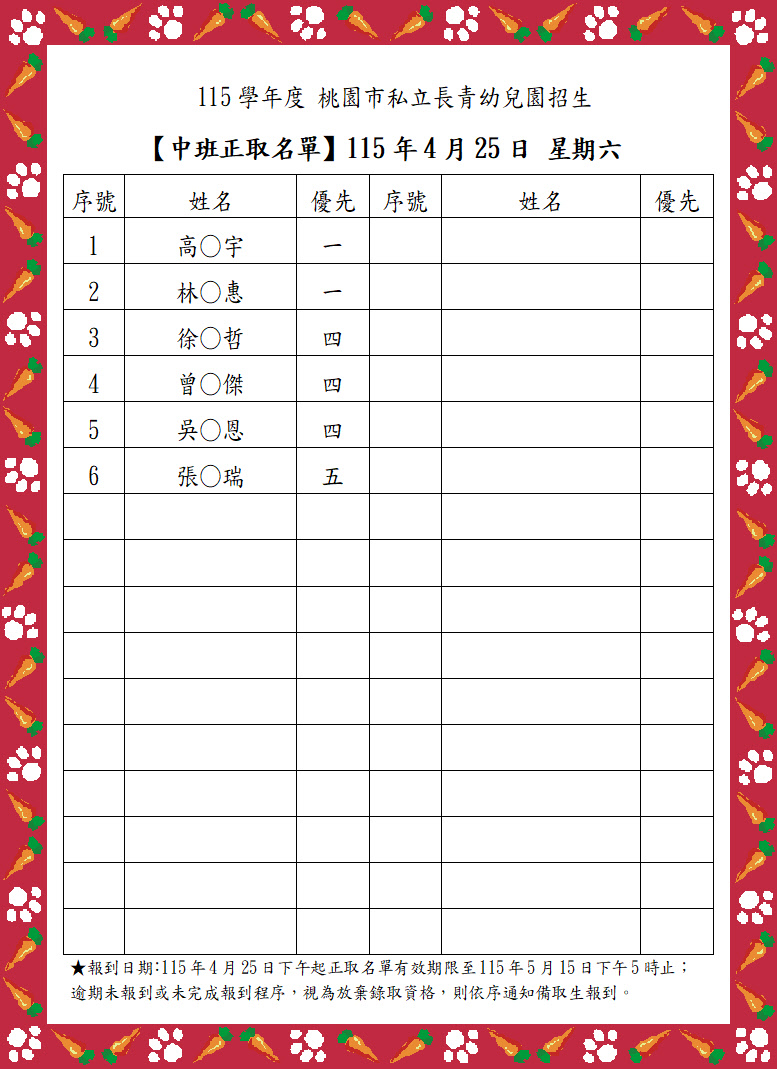 正取生家長請於5/15(五)下午17:00前至本園報到,繳交代辦費用並領取用品和入園須知表。