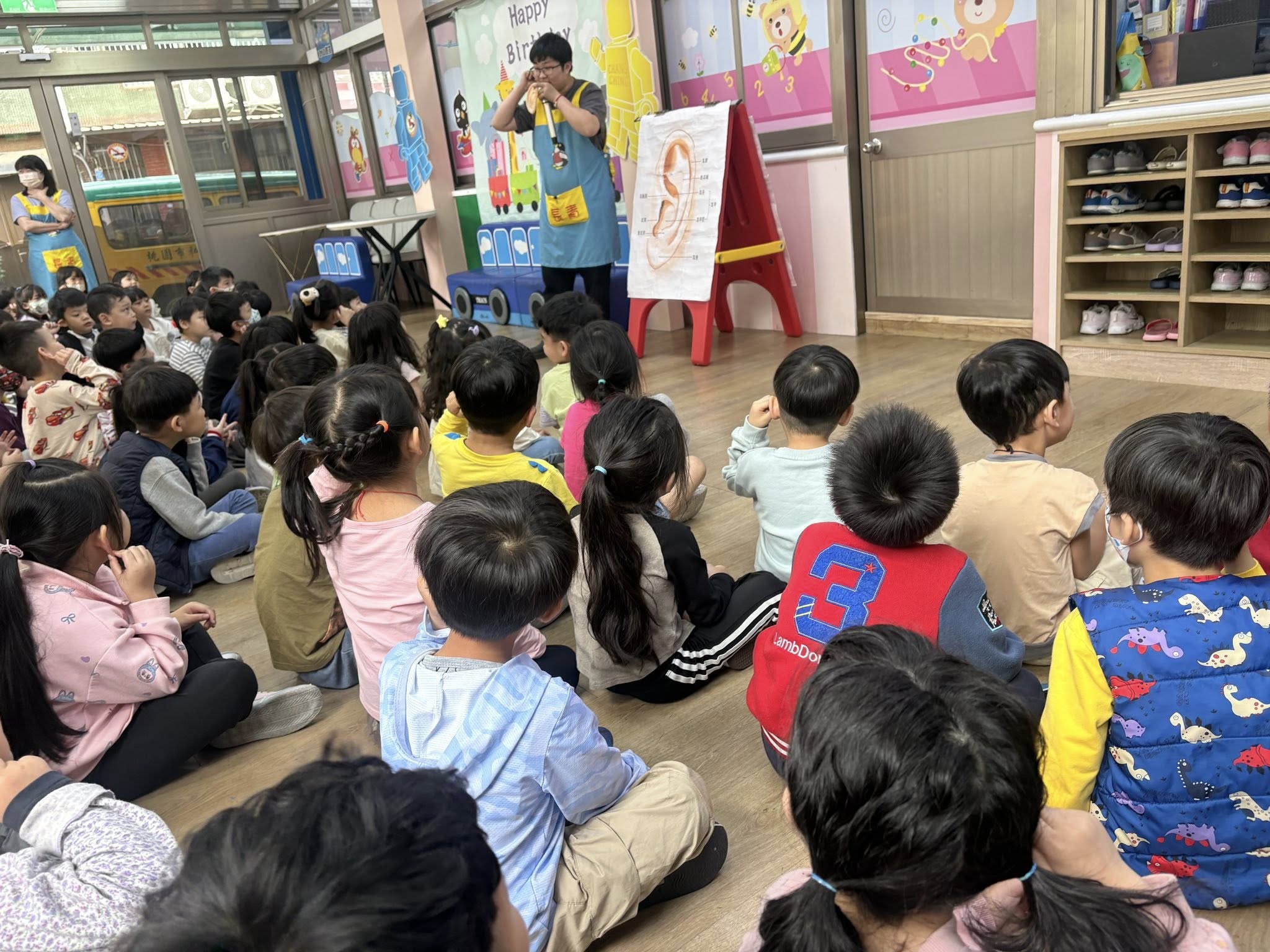 老師透過海報讓幼兒瞭解如何保護耳朵~~